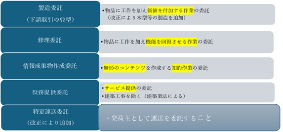 現行の下請法では、適用される取引として、従前の製造委託・修理委託・情報成果物作成委託、役務提供委託が定められていました。