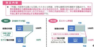 従来の「買いたたき」禁止のルールをそのまま残した上で、「協議を適切に行わない代金額決定の禁止」が禁止行為として新たに追加されました(「決定」には、代金引上げ・引下げの他、据え置くことも含まれます。)。
