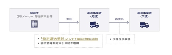 これに対し、取適法では、「特定運送委託」という新たな委託類型が追加され、発荷主から運送事業者への一定の委託も適用対象となります(取適法2条5項)。
